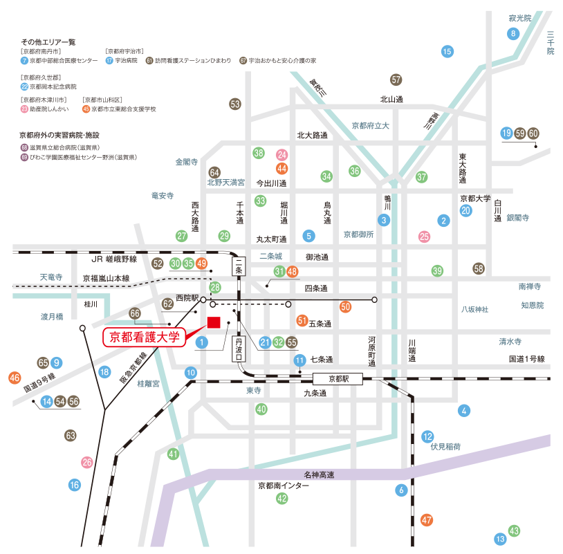 実習先は、京都市内の病院・施設を中心に約70。最先端医療を担う病院から地域包括ケアシステムに対応した病院までそれぞれに特色があり、多様な医療・看護の現場を知ることができます。