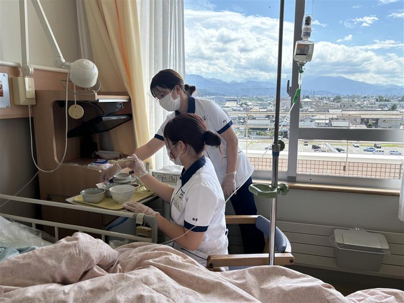 病院概要説明、病院施設見学、看護ケア体験、配膳、先輩看護師との交流会に加え、